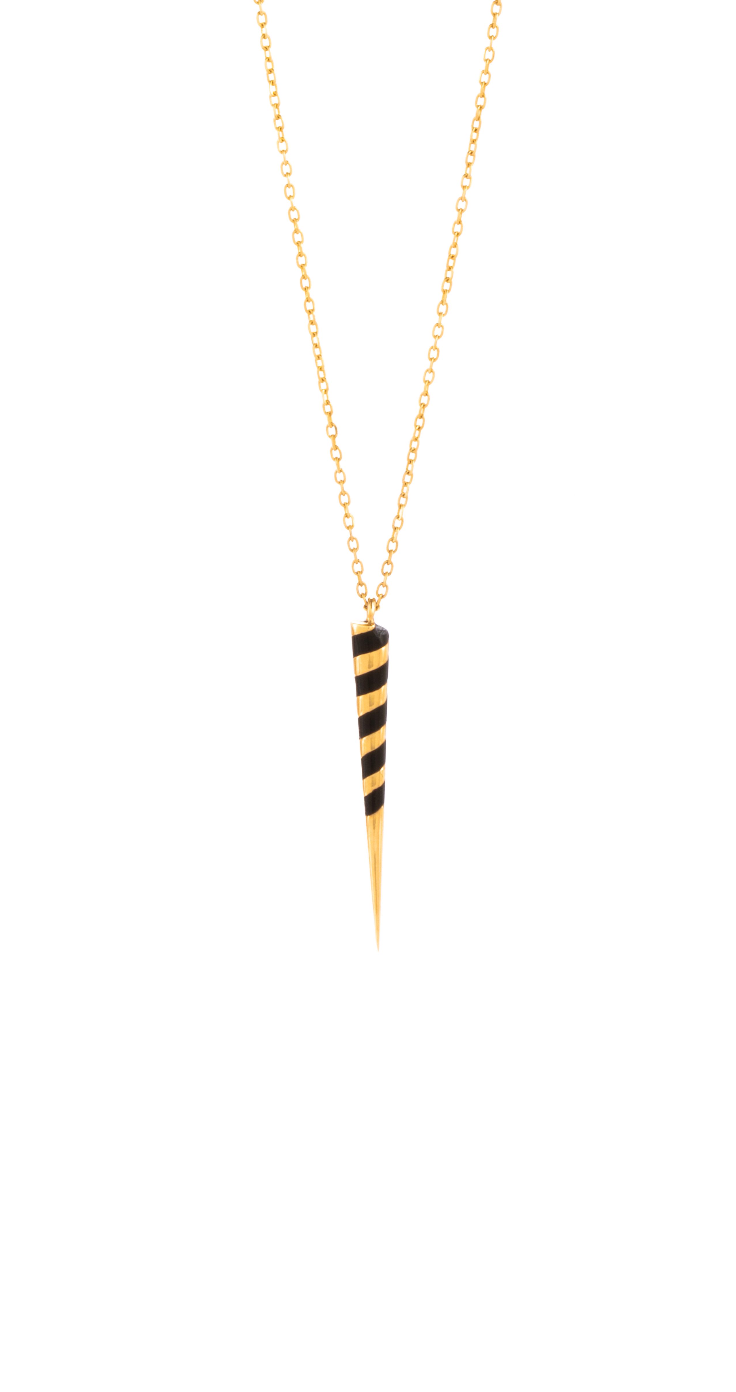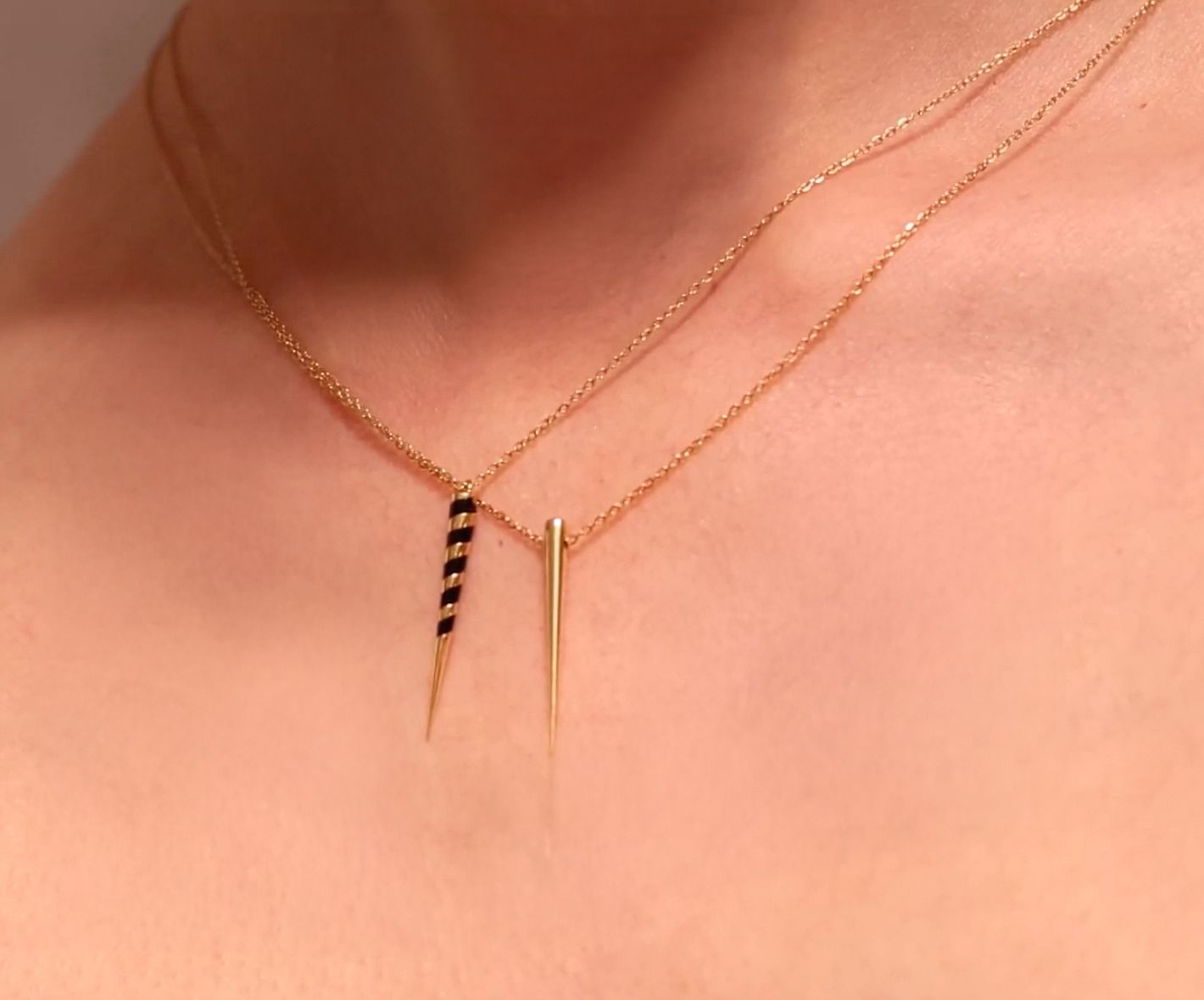 Dynamic and refined, the Tourbillon pendant features a gold pin-shaped design with enamel swirling elegantly inside. Available in black, white or colored enamel, this striking piece embodies movement and modern sophistication. Wear it alone or layer it for a bold, versatile look.