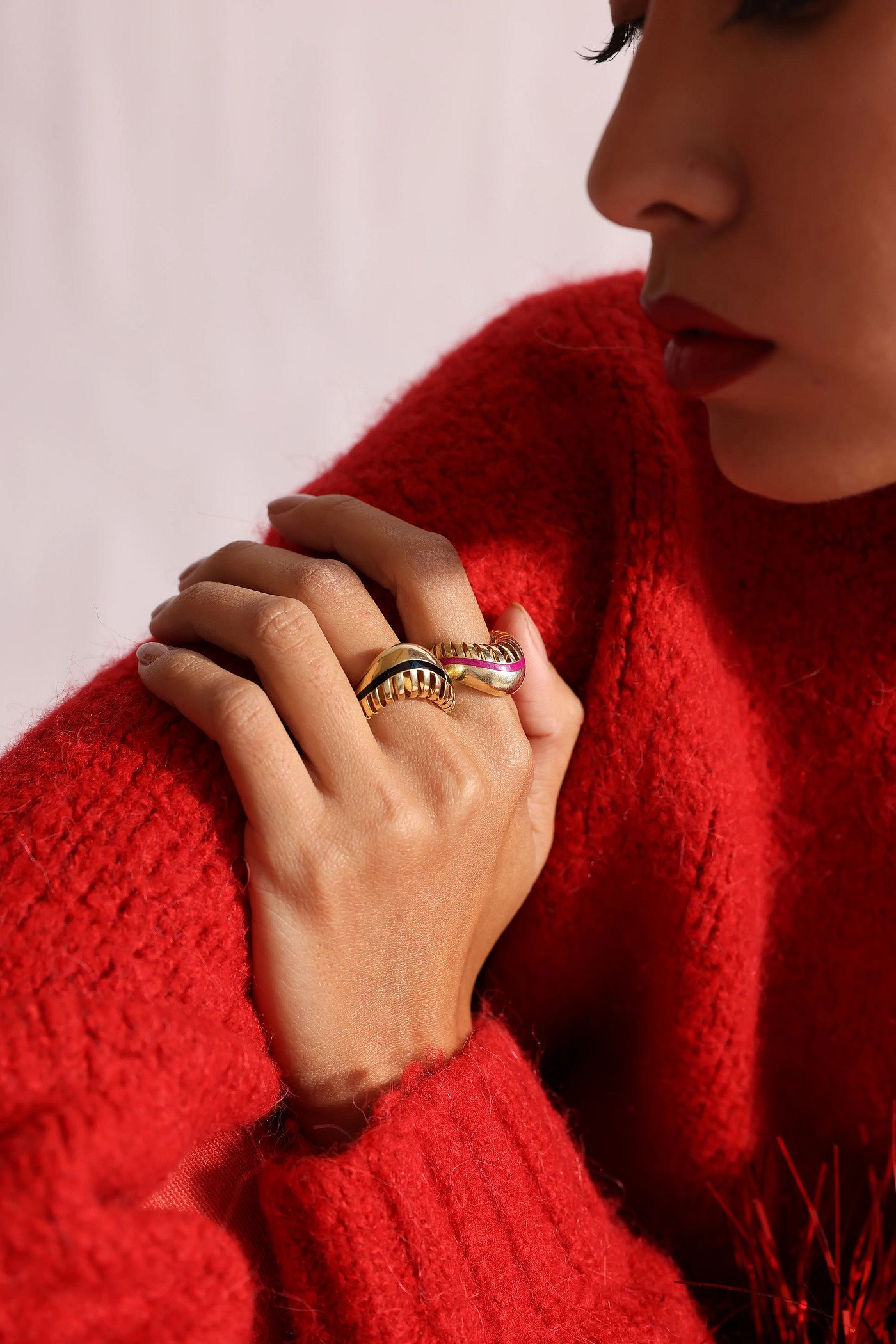 Featuring a sleek enamel line down the middle, Energy combines movement and contrast in a unique, eye-catching piece. Whether you go for the edgy black or playful pink, the ring adds a touch of vibrancy to your style, making it the perfect accessory to energize any look.